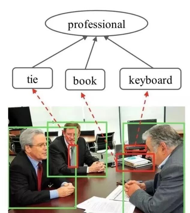 通过常见的典型标签:领带、书、键盘,程序可以初步判断,这是一次商务活动,而不是家庭聚会,所以,他们三个人是工作关系或者是职业关系。