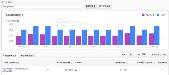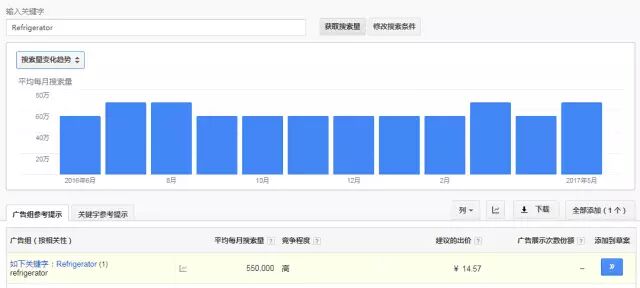 除了深挖客户的购买行踪以外,卖家还要关注与Refrigerator相关性的关键词平均每月的搜索量情况,清楚自己的竞争情况,也有利于自己优化关键词营销策略。