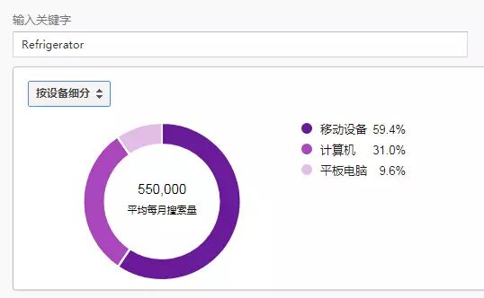 通过以Refrigerator为例,分析了该产品的平均每月搜索量变化趋势,搜索设备使用情况、各细分区域搜索量占比、移动设备上平均每月搜索量变化趋势,以及相关性关键字的搜索情况。