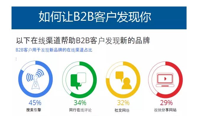 45%的B2B客户通过搜索引擎发现新品牌;34%的B2B客户通过同行在线评论发现新品牌;2%的B2B客户通过社交网络发现新品牌;29%的B2B客户通过视频分享网站发现新品牌。