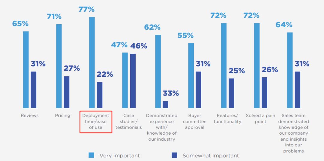 77%的B2B买家将产品易用性作为最终购买时的重要评估条件,换句话说,卖家要注重产品演示和概念验证在产品页面的展示。B2B卖家可以通过展示产品的易用性、快速部署时间和更高效的解决方案,以比竞争对手更快地赢得买家的信任。