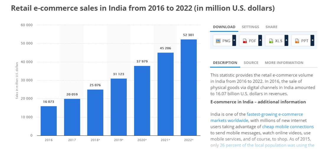 根据Statista统计数据显示,2016年印度电商市场规模达到160.7亿美元,2017年达到200.6亿美元,预计2018年将达到250.8亿美元,呈现超25%的增长率,预计到2022年印度的电商市场规模将超过500亿美元,具有巨大的市场潜力。对于想要做跨境出口电商的中国卖家来说,是一个不可忽视的机会。