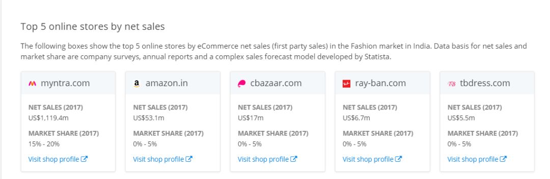 而根据Statista调查数据,印度时尚市场上电子商务在线销售额排名前五的电商平台为:myntra、亚马逊印度站点、cbazaar、ray-ban、tbdress。