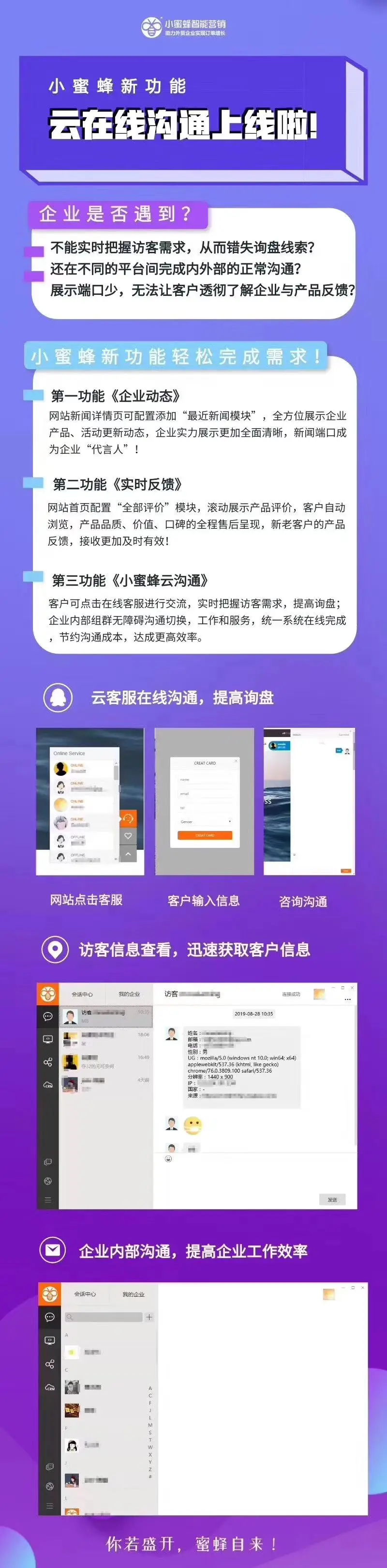 《小蜜蜂云沟通》:客户可点击在线客服进行交流,企业内部组群无障碍沟通切换,工作和服务,统一系统在线完成,节约沟通成本,达成更高效率!